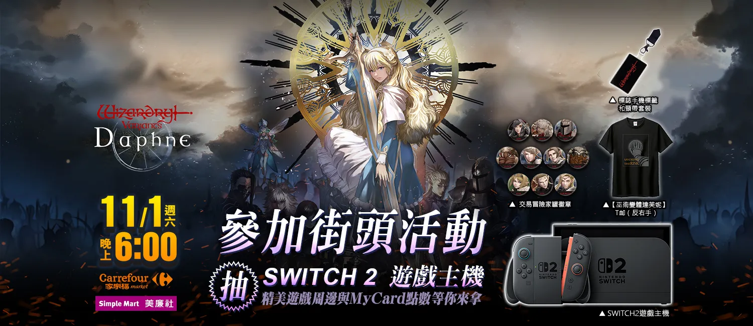 活動期間,參加「奈洛之門」知識猜謎,就有機會獲得SWITCH 2主機、MyCard點數500點、【巫術變體達芙妮】T卹(反右手)、貝納頌經典咖啡兌換券等豐富好禮!